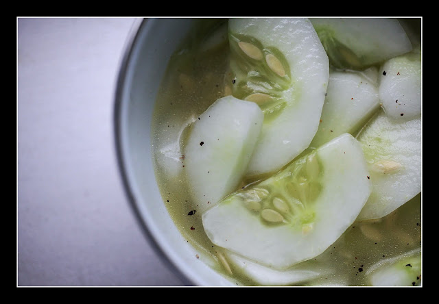 One of our favorite, most refreshing summertime snacks is cucumber salad. My mom used to make it all the time when we were kids and we loved it. I know I have the real recipe from her somewhere but I have been way too busy (or lazy?) to try to find it lately. So instead, I do like I normally do when I cook – and throw things together until it tastes good to me. 🙂 In this case: a little salt, pepper and oil – a lot of vinegar – and a splash of sugar. (As far as James is concerned, I can never put enough vinegar & salt in.)