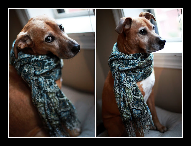 I originally had James take a picture of the scarf I wore today around my neck (minus my head/face – because you all don’t need to see that) but then realized how lame it was. Then I had an idea – I know someone who would look way cuter in my scarf… 🙂