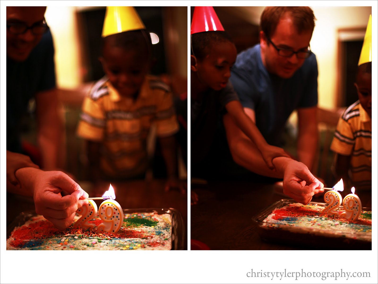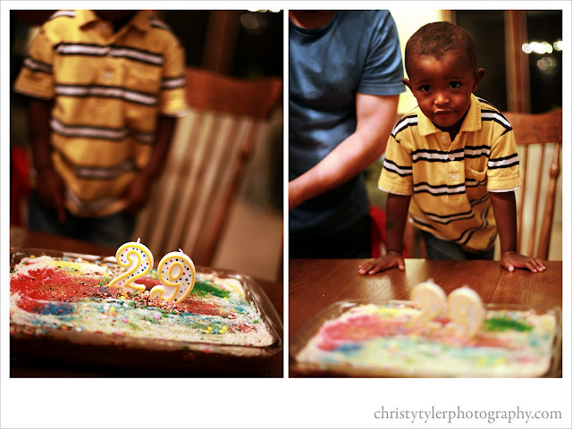 I think one of my littlest nephew’s all-time favorite songs to sing is the Happy Birthday song. Seriously – the kid gets the biggest grin on his face when he or anyone else sings it (especially when cake is involved & its a real birthday). In the pic on the left I laughed so hard at his adorable little self that I blew out my candles inadvertently! So then we re-lit them and I invited the boys to come sit with me and help me blow them out (much more fun that way).