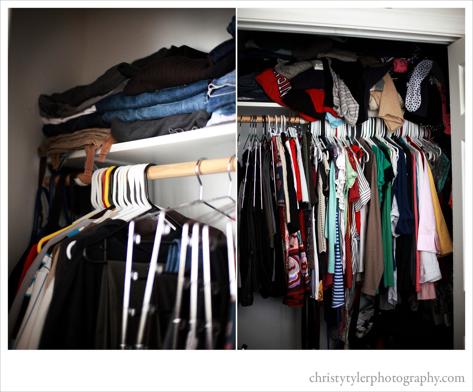 On the left is James’s side of the closet. On the right is mine, obviously. Notice how he has two neat piles of clothes folded on the shelf. Notice how he has less than 20 hangers of shirts and pants. (Those silver multi-hangers are mine – so don’t be confused.) Notice how I have one million hangers and about 90% of the closet. Notice how my clothes are not at all neatly folded on the shelf. What’s that you say, you can’t really see what’s going on up there? Well then, here’s a close up: