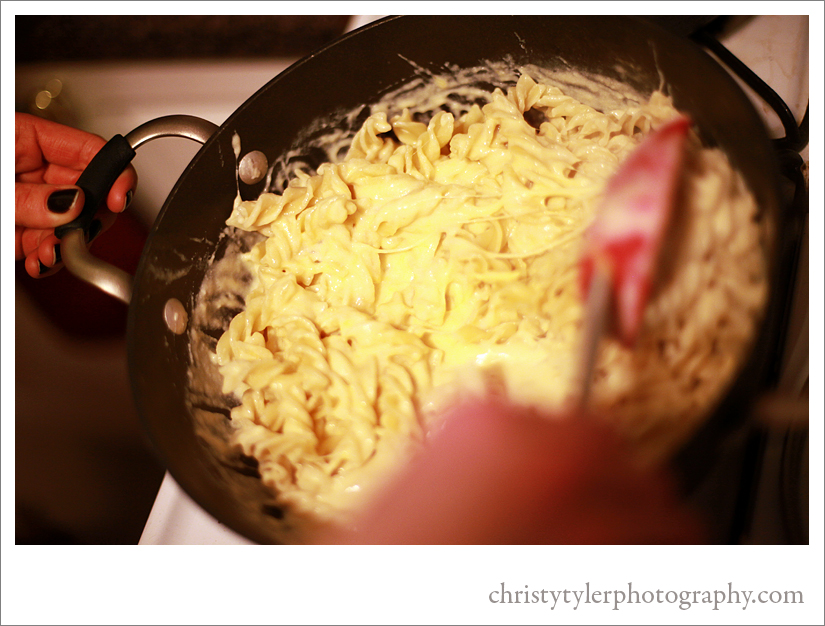 Next, preheat the oven to 375 degrees and boil water in a large pot. Add 2 cups of elbow macaroni to boiling water. (We used different noodles, as you can see… and because they are less dense than elbow macaroni when measuring them out – I used about 2 1/2 to 3 cups instead.)