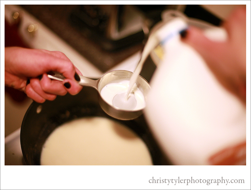 Stir until thoroughly blended. Gradually add in 2 1/2 cups of milk. (I added 1/2 cup at a time and whisked the mixture in between each time.) Continue stirring and cooking until mixture thickens slightly.